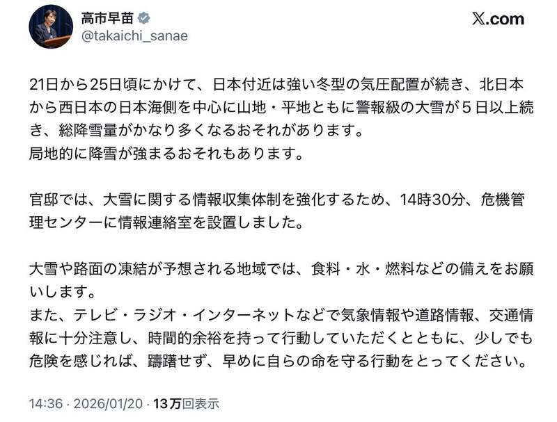活動記録【2026年1月20日 14:36 高市早苗総理 X】