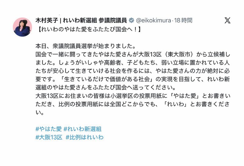 【木村英子参議院議員からのエール❤️】自分でコメントをもらいに行きました🌈笑木村議員とはチーム… お知らせ 2026.01.28 【木村英子参議院議員からのエール❤️】 自分でコメントをもらいに行きました🌈笑 木村議員とはチーム厚労として様々な勉強会や国会質問準備をこれまでしてきました🔥誰もが生きてて良かったと思える社会を目指すにはまだまだやりたいことがあります🌈 ※スタッフ投稿(X引用) #木村英子 #れいわ新選組 #八幡愛 #東大阪