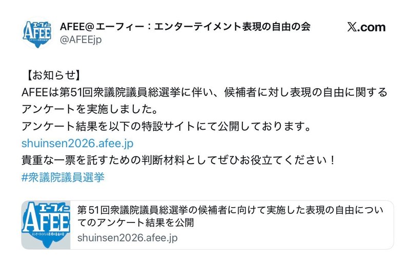 個人的にいつも楽しみなアンケートです🔥ぜひチェックしてみてください🌟👀〈AFEE@エーフィー:… お知らせ 2026.01.29 個人的にいつも楽しみなアンケートです🔥ぜひチェックしてみてください🌟👀 〈AFEE@エーフィー:エンターテイメント表現の自由の会〉 https://shuinsen2026.afee.jp/ ※スタッフ投稿(X引用) #れいわ #れいわ新選組 #やはた愛 #八幡愛 #東大阪