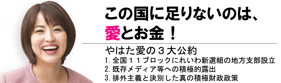 れいわ新選組 衆議院議員・やはた愛は、この度の第二回れいわ代表選挙において、代表の座を目指して立候補いたしました。このページではこの度の立候補に際する、私の具体的政策を読むことが出来ます。 ・決意表明はこちらをご覧ください。 |
